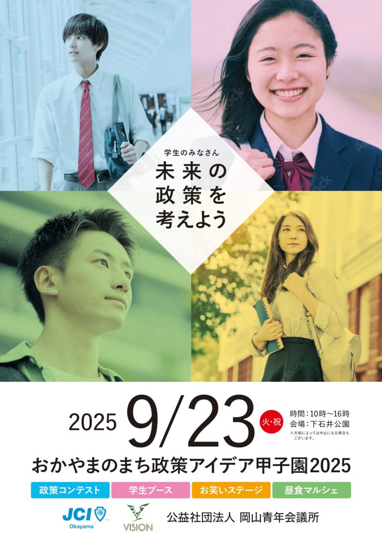 2025年9月23日(火・祝)、岡山市の下石井公園で開催された岡山青年会議所主催「政策アイデア甲子園2025」において、岡山県立東岡山工業高等学校の生徒さんと現代経営学科の2年生の赤崎凛君、澤笑生君による混合チームで出場し、6チームのエントリーの中から岡山青年会議所理事長賞を受賞しました。