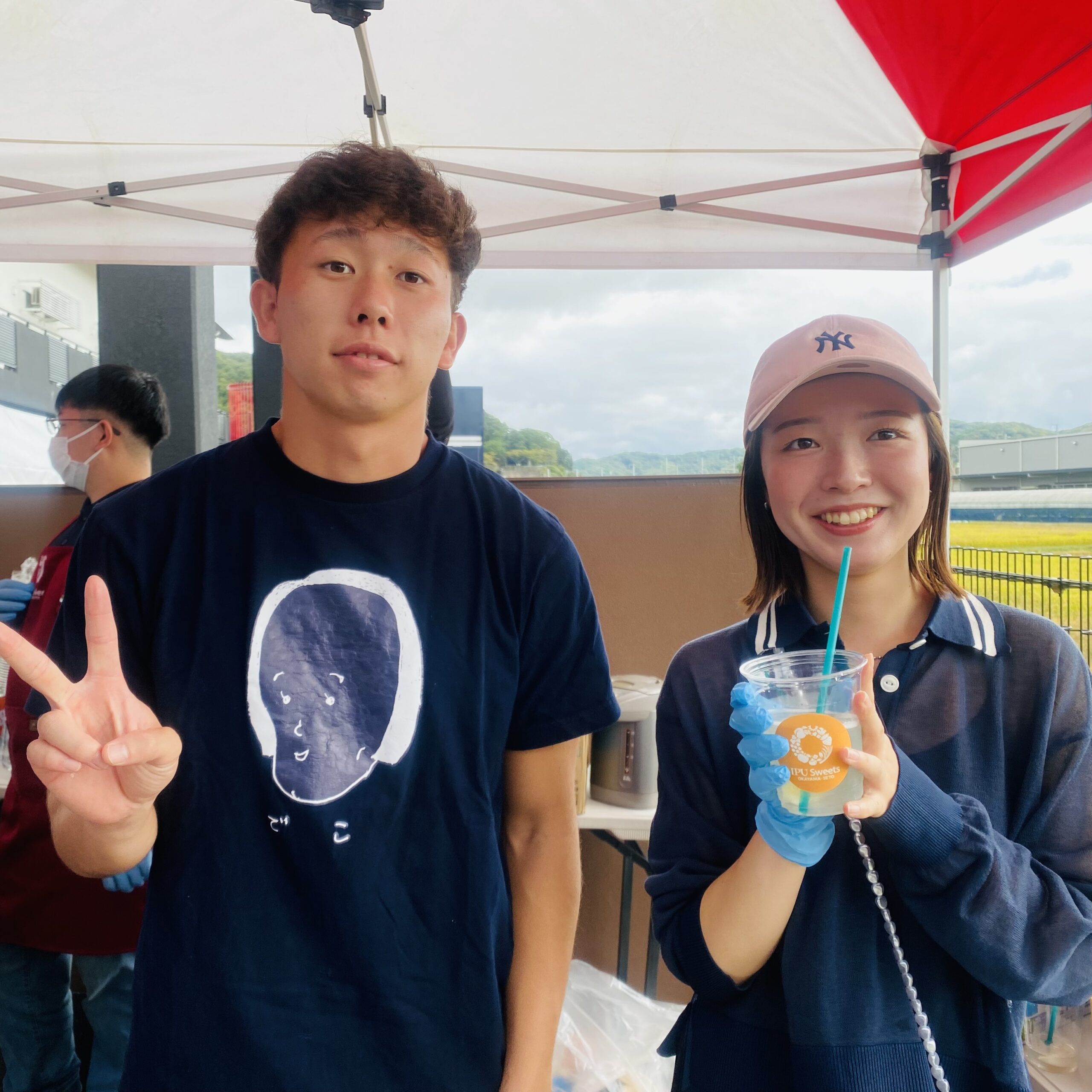 これらのメニューは、学内ビジネスプランコンテストやおかやまSDGsアワード、学生イノベーションチャレンジ推進プロジェクトなどで受賞した学生プロジェクトから生まれたもので、扇野ゼミとしても過去最大規模の出店挑戦。参加したのは、扇野ゼミ所属、現代経営学科3年の針間一颯さん、長岡依吹さん、北垣彪翔さん、ズオン フエン アインさん、チュオン ミン ゴックさん、4年の文田夏帆さん、田中万智さん、林海穏さん。次世代教育学部 教育経営学科3年の加藤心太朗さんも駆けつけてくれました。