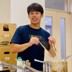 じゃがいもは、サッカー部が栽培しているものを現代経営学科2年、内山陽太君から仕入れ、いざ調理へ。