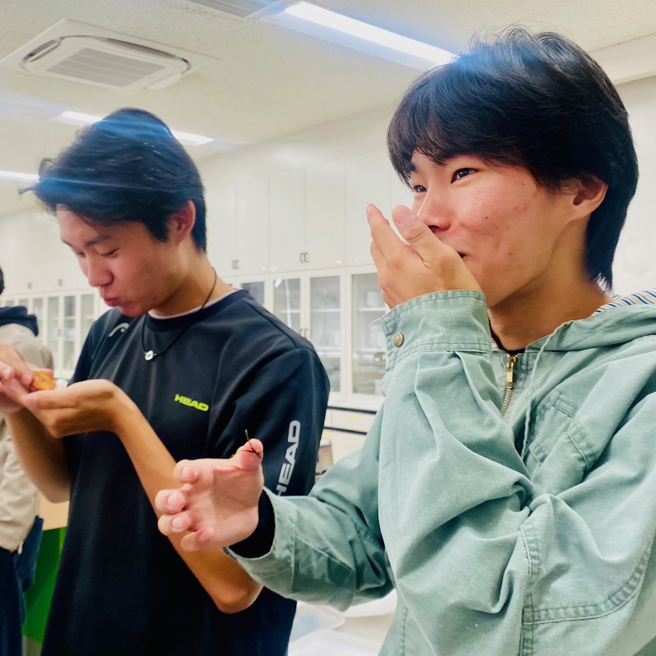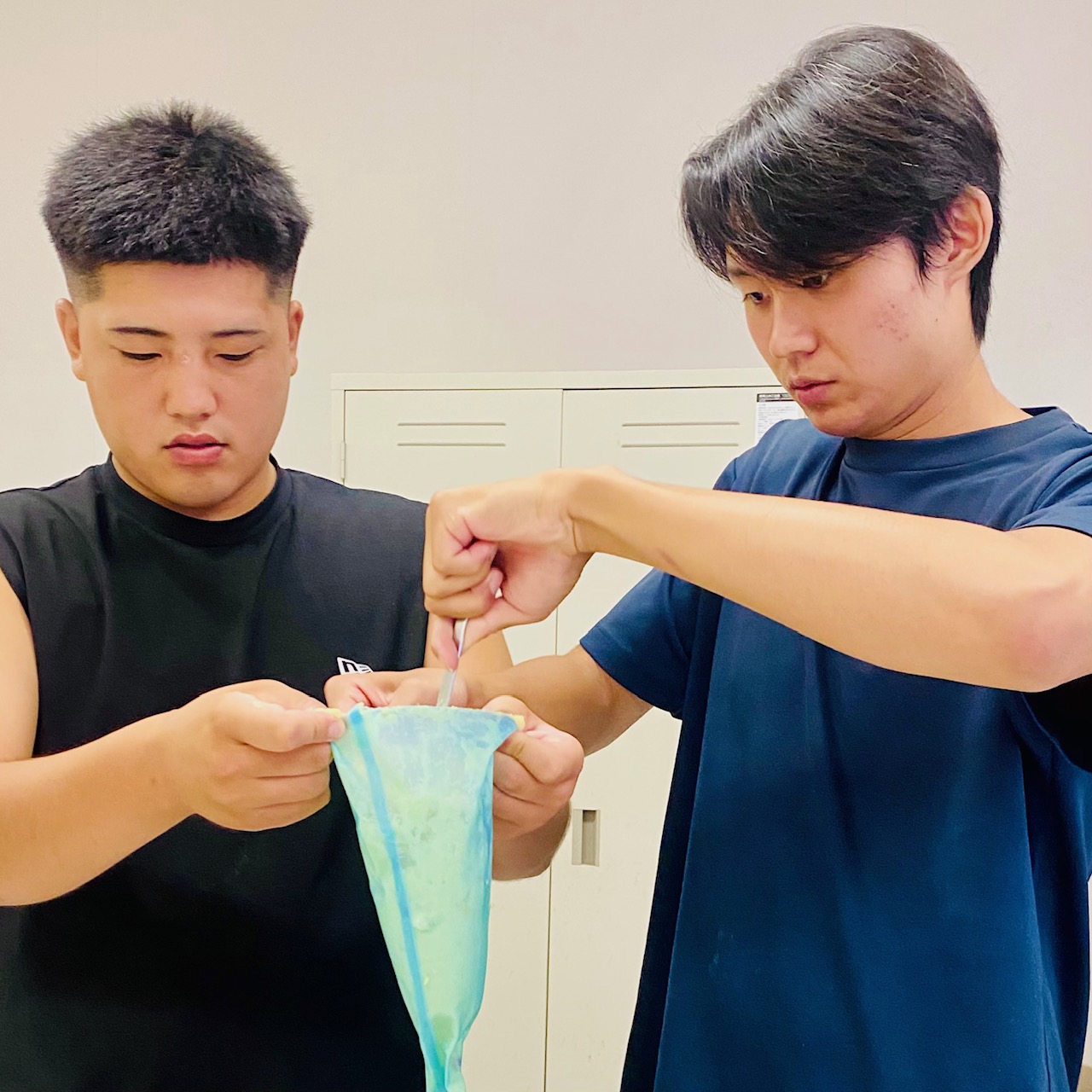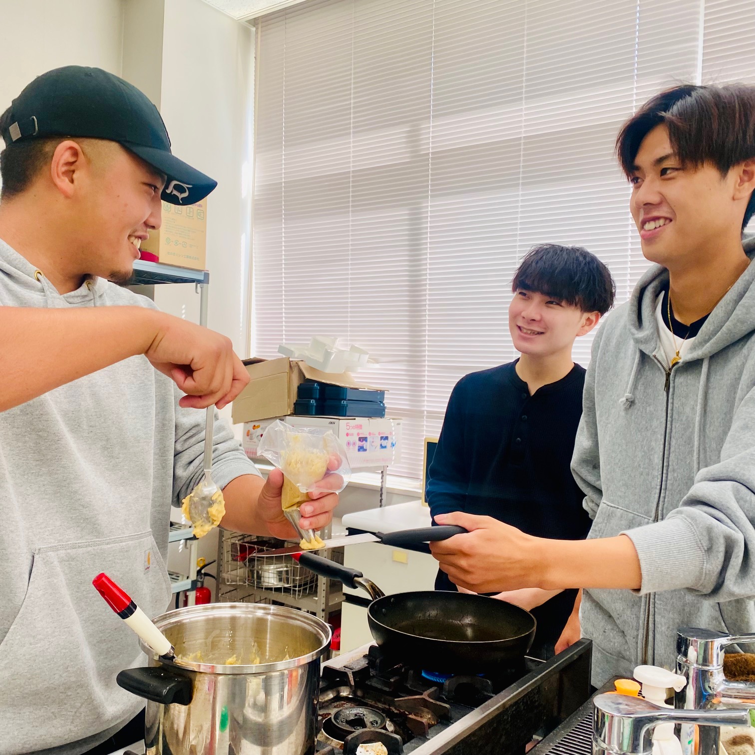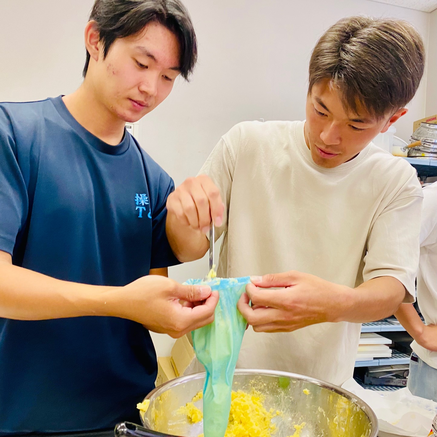 まずは、共感してくれた4年ゼミ生の 池田港斗君、林海穏君、文田夏帆さんと一緒に開発をスタート。「じゃがいもだけでチュロスを作ったらどうなる?」という素朴な疑問から、試作が始まりました。