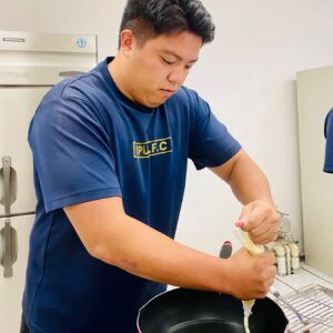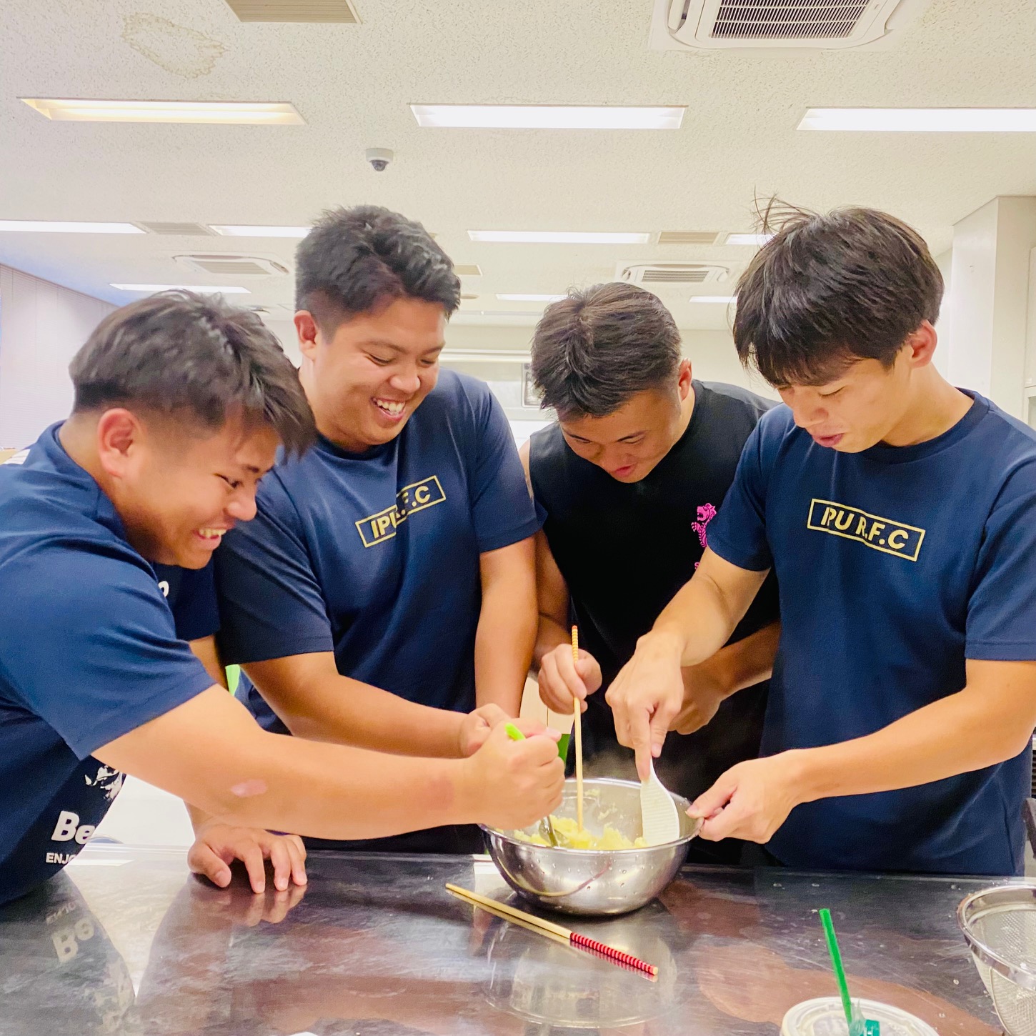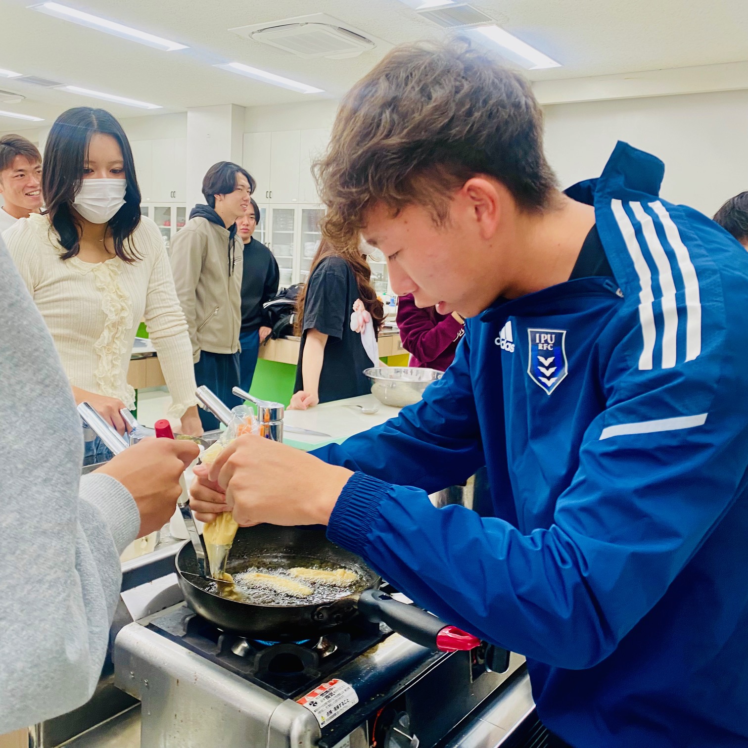 じゃがいもは、サッカー部が栽培しているものを現代経営学科2年、内山陽太君から仕入れ、いざ調理へ。