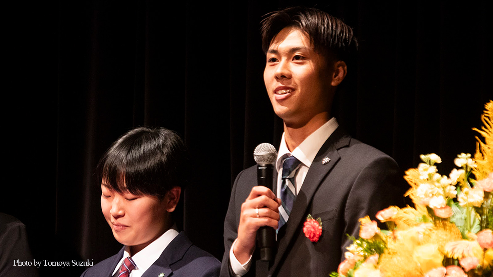 当日は、ゼミ生代表として現代経営学科3年の水嶋悠斗さんと岡山県立東岡山工業高等学校1年の岡本希望さんが登壇し、高大連携の成果を発表。